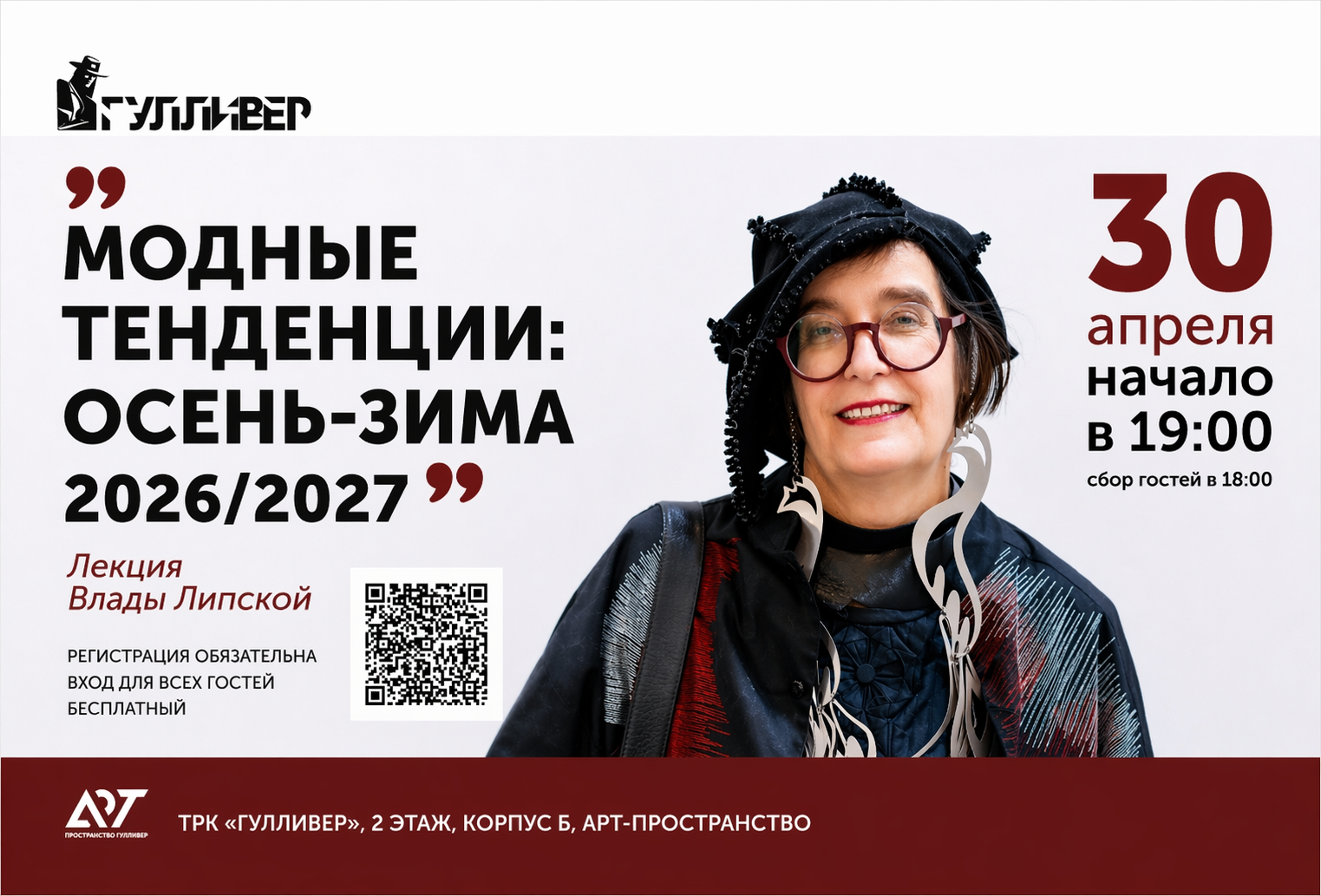 30 апреля в Арт-пространстве Гулливер состоится авторская лекция Влады Липской на тему «Модные тенденции: осень-зима 2026/2027».